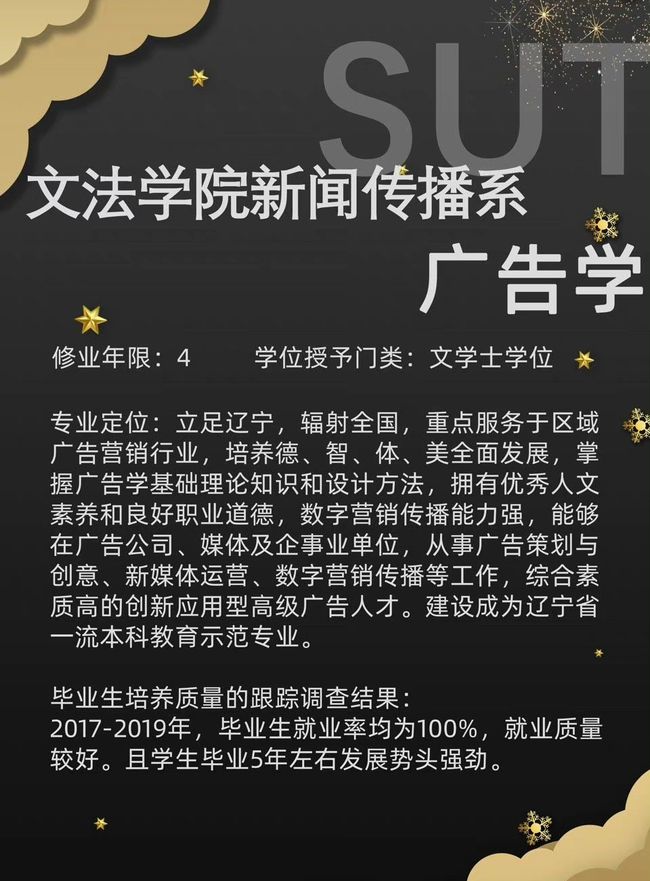 沈陽工業大學的廣告學專業,是在互聯網時代下誕生并高速發展起來的一條“和諧號高鐵”,本專業培養能熟練掌握廣告學基礎理論知識和設計方法,熟悉廣告流程和廣告策劃,具有較強設計能力、創新精神和良好從業道德,能在廣告公司、媒體及企事業單位,從事廣告策劃與創意、市場運作與管理等工作,綜合素質高的應用型高級專門人才。廣告學專業的學生們立足實戰,從大一入學開始就進入實訓階段,專業老師重點培養學生自媒體運營與營銷能力,每年均達到“百分百就業”。