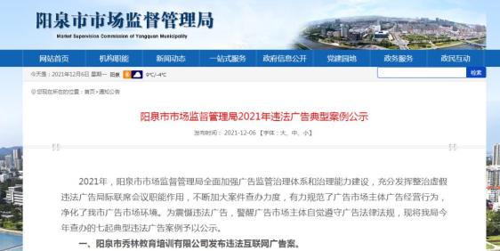 一、陽(yáng)泉市秀林教育培訓(xùn)有限公司發(fā)布違法互聯(lián)網(wǎng)廣告案